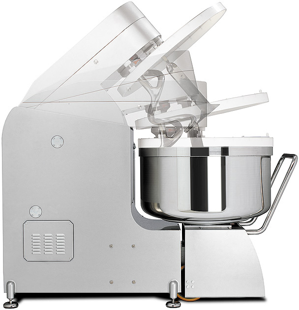 Конус управляется гидравлическим приводом и сцепляется под дежой, поддерживая постоянное давление во время эксплуатации и устраняя любую вероятность проскальзывания и износа. Вращение дежи обеспечивается коническим валом, гарантирующим постоянное число оборотов дежи, вследствие чего улучшается качество теста и эксплуатационные характеристики машины. Система тяги является бесшумной и лишенной механических люфтов.
