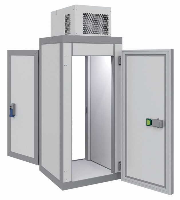 Камеры поставляются в комплекте с холодильными машинами. Их можно без труда разобрать и перенести в другое нужное для использования помещение. Холодильной машиной в подобных камерах служит потолочный моноблок с автоматической системой выпаривания конденсата, устанавливаемый в паз потолочной панели.