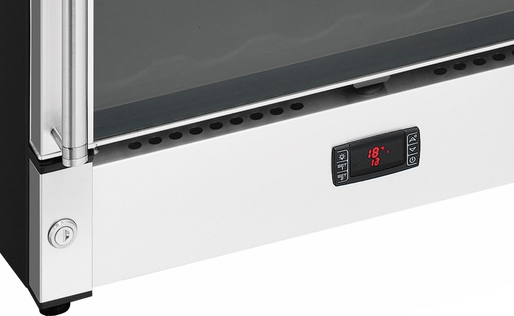 Светодиодный дисплей в винных шкафах от компании Smeg позволяет точно контролировать температуру и влажность, от которых зависит сохранность коллекционных вин. Дисплей располагается на панели управления на дверце устройства либо за дверцей на верхней части корпуса. Светодиодная подсветка отличается экономичностью и долговечностью, она абсолютно безопасна для хранящихся в винном шкафу бутылок. В зависимости от модели на дисплее может отображаться только фактическое значение температуры либо расширенная информация о температуре в каждой из зон, времени, дате, функциях меню