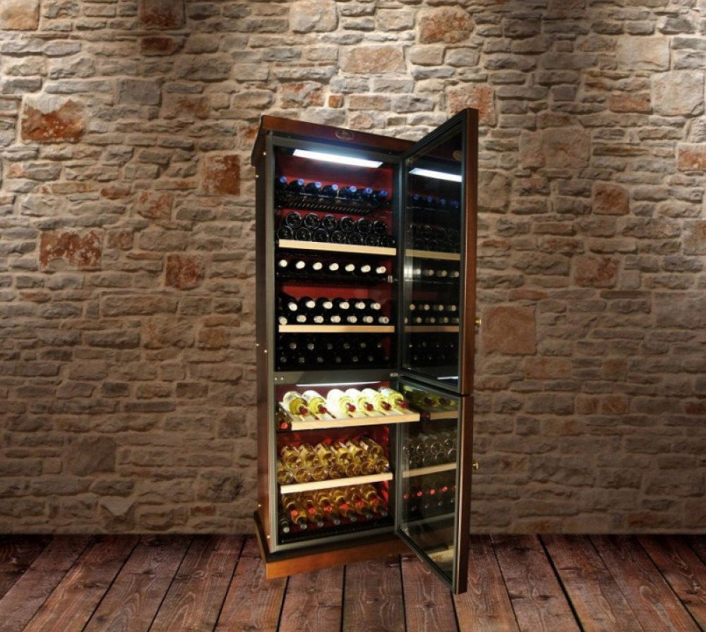 Модель оснащена статической системой охлаждения на базе компрессора SECOP (Danfoss), которая кроме охлаждения вина еще и сохраняет оптимальную влажность внутри камеры. Комплектуется шкаф девятью деревянными полками.