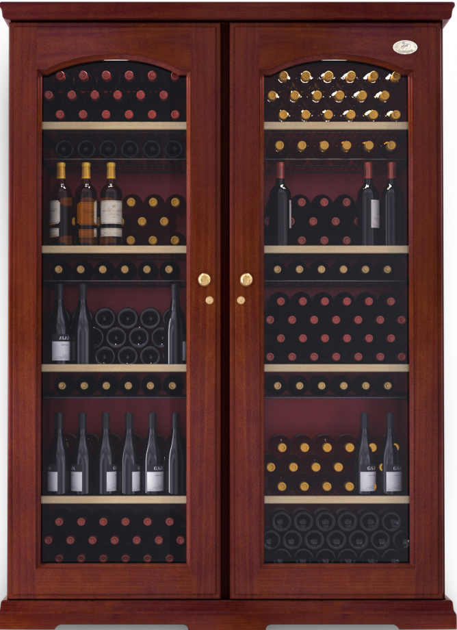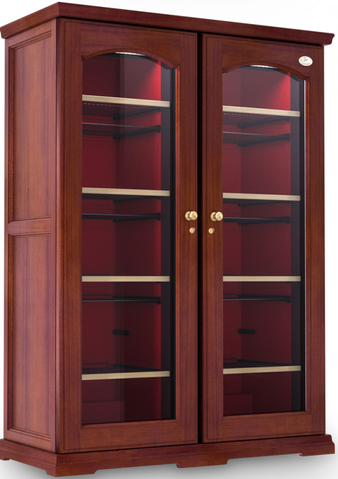 Корпус холодильника металлический, внешняя отделка выполнена из древесины Risto Line в четырех цветовых решениях. Модель двухдверная, каждая дверца изготовлена из двойного стеклопакета с защитой от уф лучей, имеет встроенный замок и удобную ручку.