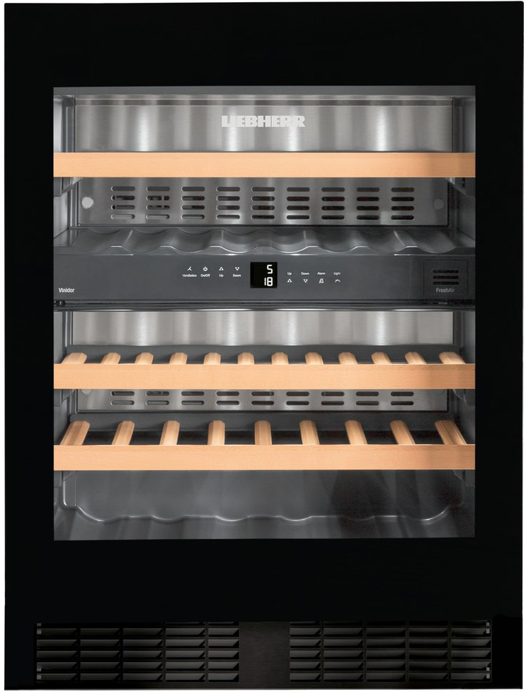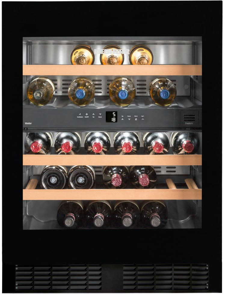 Модель выполнена в элегантном цвете «черное стекло», она превосходно подойдет для охлаждения коллекционных вин перед подачей к столу. В числе ее преимуществ — награда Plus X Award за лучший дизайн, качество и экологичность. Стильный внешний вид подчеркивает монтаж дверцы вровень с поверхностью. Стеклопакет в дверце поможет защитить содержимое от ультрафиолетового излучения, влияющего на вкусовые качества вина. Два независимых контура охлаждения препятствуют смешиванию запахов. Три полки без труда выдвигаются на телескопических направляющих. Модель отличается низким энергопотреблением класса А+, и пониженным уровнем шума, который составляет всего 36 дБ. Функции панели управления могут быть заблокированы от случайного изменения настроек. На панели управления расположен индикатор неисправностей, прежде всего оповещающий о повышении температуры в камере. Климатический класс SN-ST позволяет эксплуатировать устройство при наружных температурах от +10°C до +38°C. Для каждой полки прилагаются специальные этикетки для указания сорта вин, года закладки на хранение и т.п.