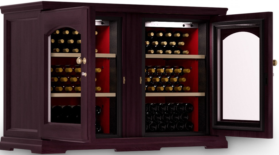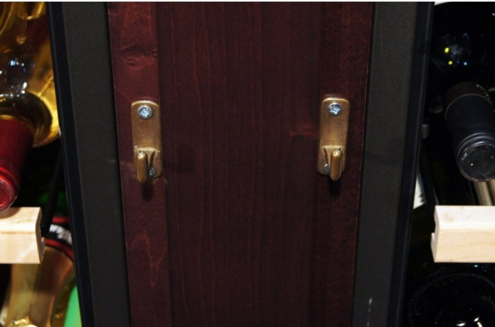 Корпус холодильника металлический, внешняя отделка выполнена из древесины Risto Line в четырех цветовых решениях. Модель двухдверная, каждая дверца изготовлена из двойного стеклопакета с защитой от уф лучей, имеет встроенный замок и удобную ручку.