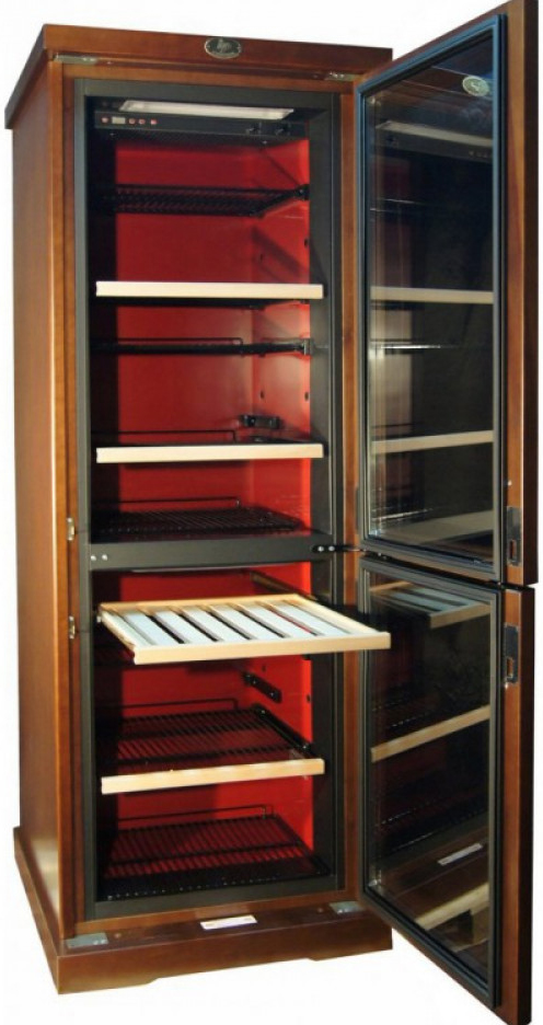 Модель оснащена статической системой охлаждения на базе компрессора SECOP (Danfoss), которая понижает температуру вина и сохраняет оптимальную влажность внутри камеры. Комплектуется шкаф девятью полками.