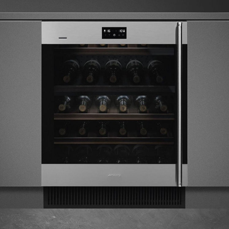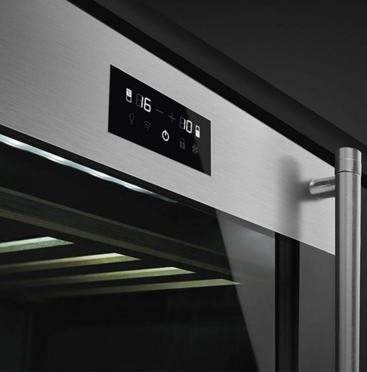 Светодиодный дисплей в винных шкафах от компании Smeg позволяет точно контролировать температуру и влажность, от которых зависит сохранность коллекционных вин. Дисплей располагается на панели управления на дверце устройства либо за дверцей на верхней части корпуса. Светодиодная подсветка отличается экономичностью и долговечностью, она абсолютно безопасна для хранящихся в винном шкафу бутылок. В зависимости от модели на дисплее может отображаться только фактическое значение температуры либо расширенная информация о температуре в каждой из зон, времени, дате, функциях меню.