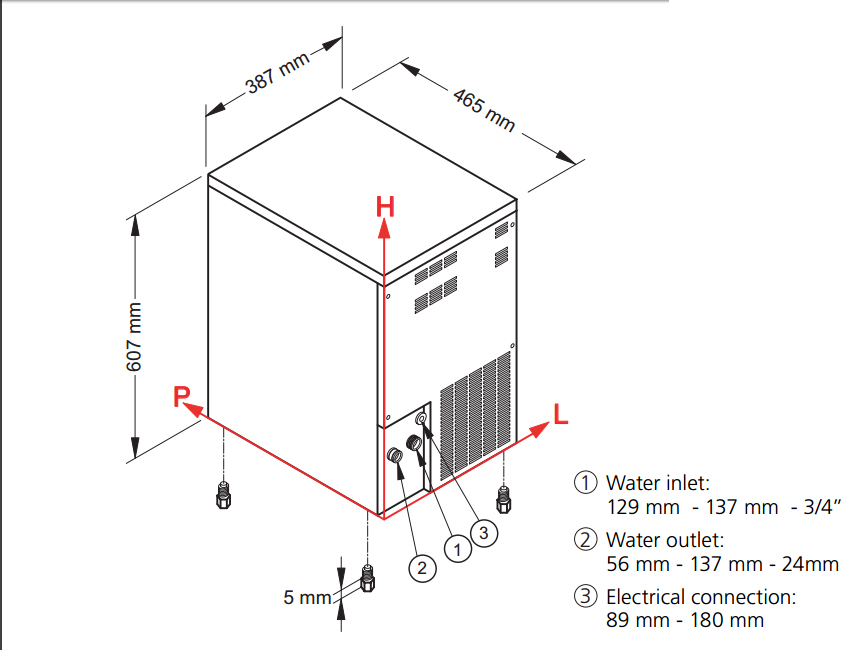 Для монтажа льдогенератора необходимы подводка холодной воды (вентиль 3/4″), а также отвод воды (сток Ø 24 мм).