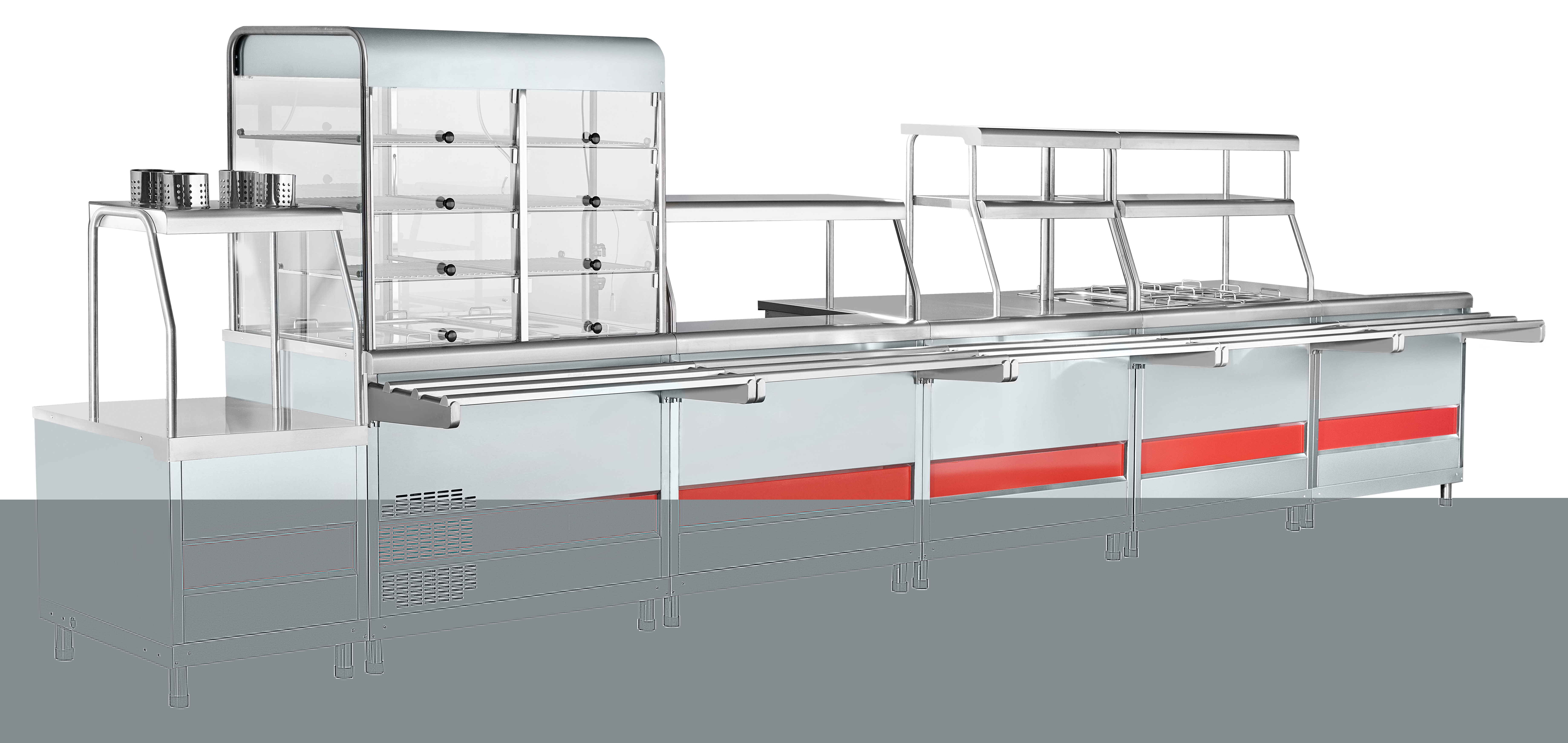 Цена линии раздачи из "кашированного" металла равна цене линии раздачи из нержавеющей стали.