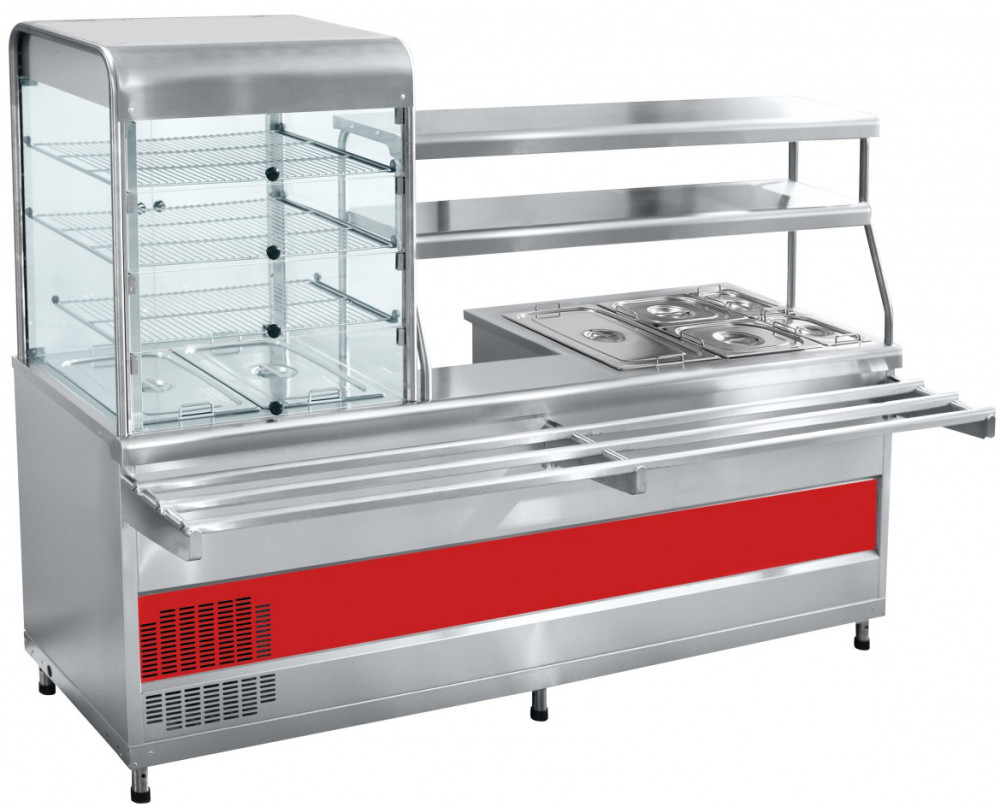 Сочетает в себе сразу 3 прилавка- холодильную витрину, мармит первых блюд и мармит вторых блюд.