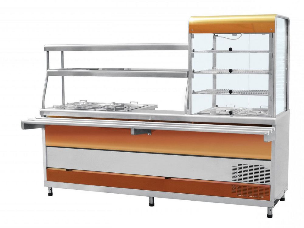 Прилавок-витрина холодильный мармитный универсальный Abat ПВХМ-70КМУ цвет "красное золото" витрина справа предназначен для кратковременного сохранения: холодных закусок в витрине, а также первых и вторых блюд в гастроёмкостях в горячем состоянии и раздачи их потребителям.