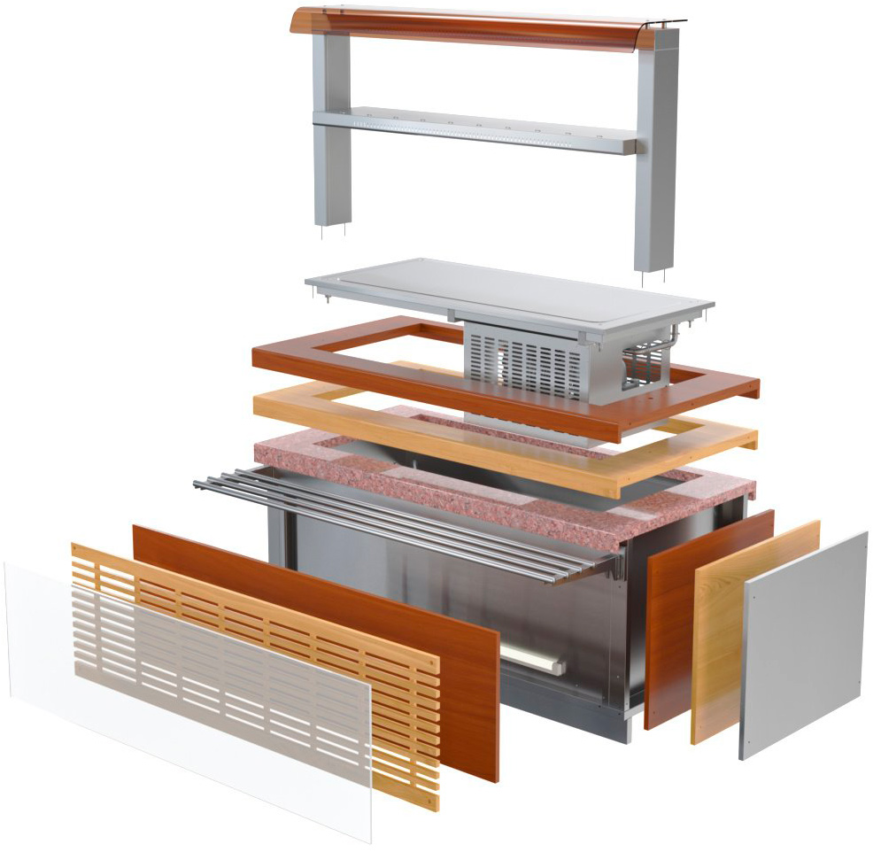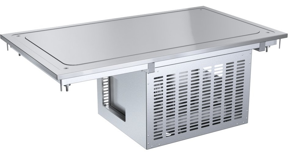 Охлаждаемая поверхность представляет собой горизонтальную площадку, которая является столешницей, изготовленной из нержавеющей стали. Напитки и продукты в фабричной упаковке или тарелках могут размещаться непосредственно на ней.