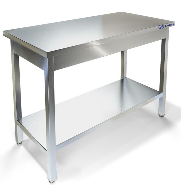 Cтол на нержавеющем каркасе из AISI430, столешница из AISI430 без борта с усилением из ЛДСП, внизу полка.
