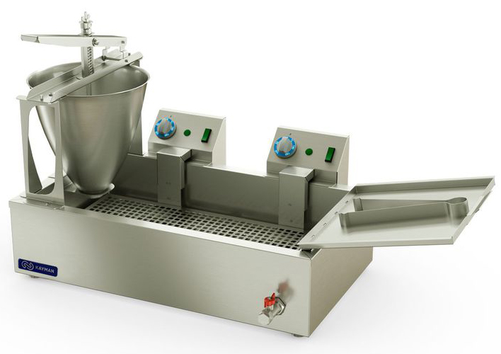 Аппарат состоит из фритюрной ванны, ручного дозатора теста, блока управления с электронагревателем и поддона для выкладки готовых пончиков.