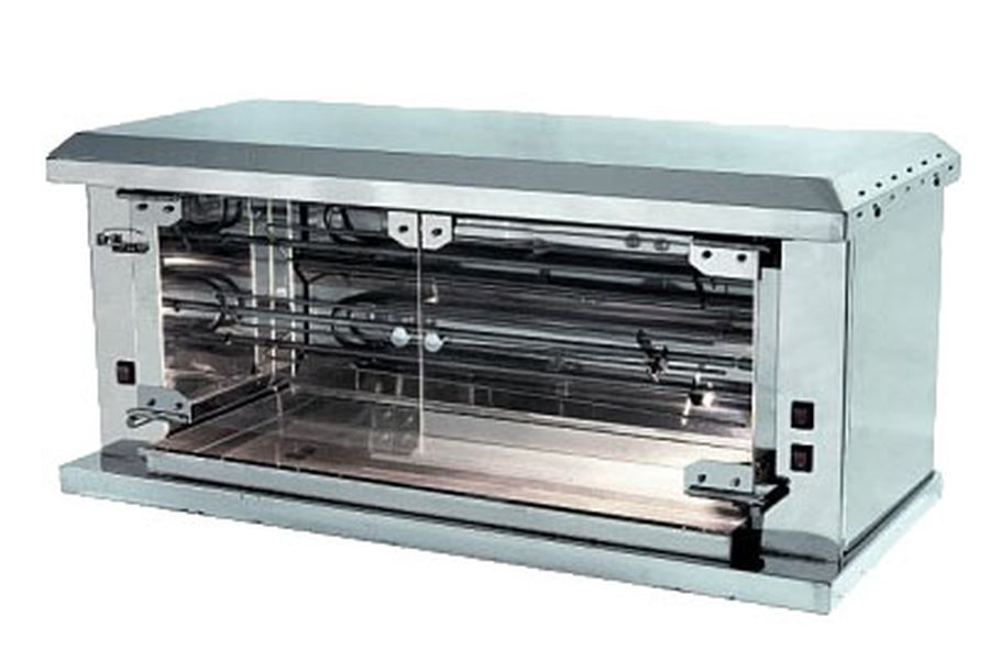 Гриль на 12 тушек, 2 шампура в первом ряду + 1 шампур во втором ряду, выполнен полностью из нержавеющей стали, готовит курицу за 55 минут.