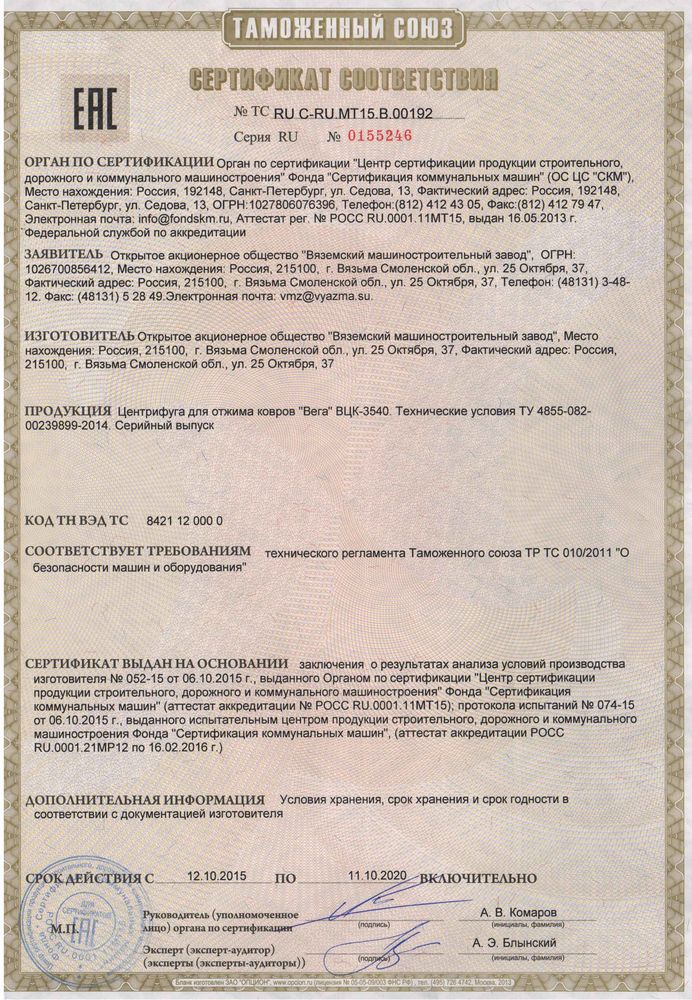 Центрифуга для отжима ковров Вязьма ВЦК-3540 предназначена для окончательного отжима влаги из тканевых ковров, скрученных в рулон (спираль), с длиной рулона не более 3,5 м в образовательных, оздоровительных заведениях, производственных предприятиях, в поликлиниках, гостиницах, детских садах, общежитиях, больницах, роддомах и воинских частях.