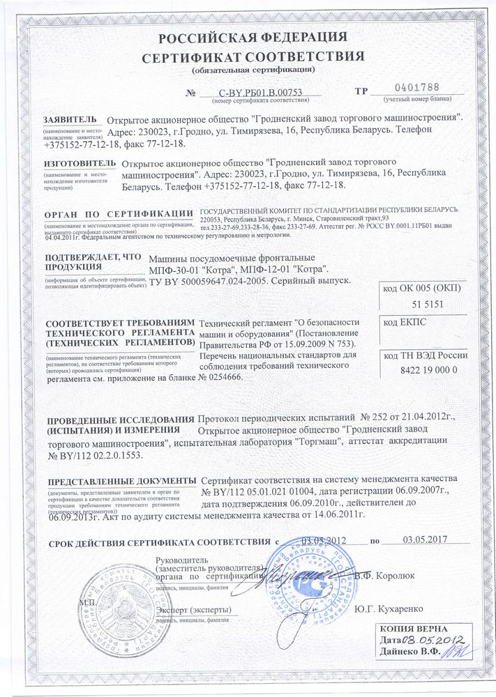 Фронтальная посудомоечная машина Гродторгмаш МПФ-30-01 "Котра" периодического действия предназначена для мытья тарелок, стаканов, чашек, столовых приборов с применением моющих средств в кафе, барах, закусочных и других предприятиях общественного питания с числом посадочных мест до 50.
