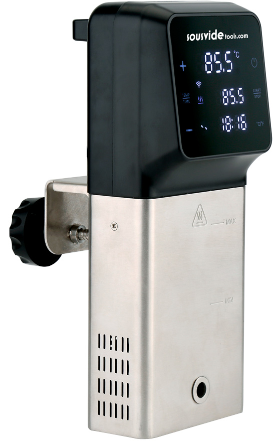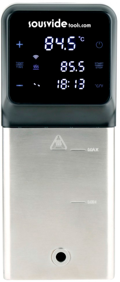 Погружной термостат SousVideTools SVT-01005EUпредназначен для приготовления пищи при низких температурах. Такой способ используется для приготовления ингредиентов, запечатанных в вакуумной пластиковой упаковке и медленно приготовляемых при низких температурах. IVide Plus - жидкостное устройство, сертифицированное по стандарту IPX7. Это означает, что если ситуация, при которой устройство будет залито водой, или попадет в воду, это не приведет к его повреждению. Эта профессиональная модель разработана таким образом, что при помощи зажима расположенного на задней стенке устройства можно закрепить термостат на боковой стенке любого подходящего контейнера из обычной стали или поликарбонатной емкости емкостью до 50 литров, тем самым максимально вырабатывая водяную баню Sous Vide с регулируемой рабочей температурой от 5 °С до 99°С, с нетерпением 0,07°С. Технология циркуляции воды в условиях отсутствия горячих и холодных зон. Таймер может быть установлен от 1 минуты до 99 часов. По ходу приготовления устройство уведомит вас как звуковым сигналом, так и по индикатору, продолжая работать. Эта модель также имеет защиту от превышения уровня воды, то есть, если вы случайно заблокировали устройство пустым или дадите повышение уровня воды, необходимо отключиться ниже минимума, термостат отключится и уведомит вас звуковым сигналом и индикацией.