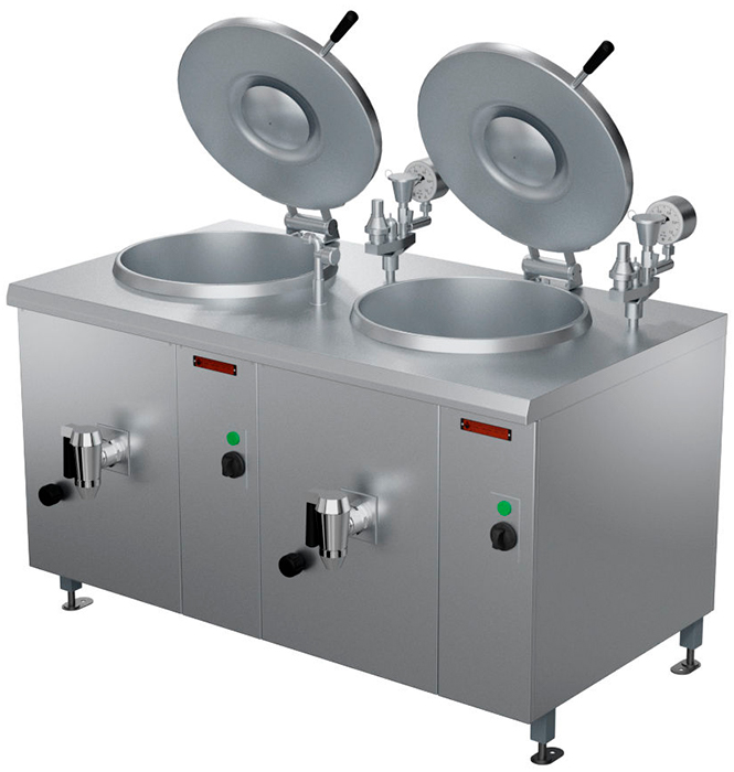 Котел пищеварочный Проммаш КЭ-150Ц с двумя независимыми варочными сосудами с негерметичной крышкой предназначен для приготовления бульонов, первых блюд, компотов, напитков, овощей, гарниров на предприятиях общественного питания традиционным способом. Возможно использование котла с применением функциональных емкостей.