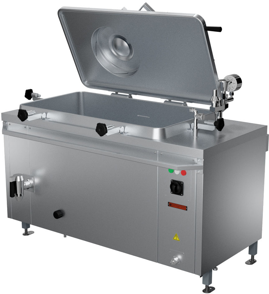 - Наличие двойной герметичной крышки. Одна крышка – прямоугольная, с накидными рычагами - служит для санитарной обработки, а также для загрузки продуктов в варочный сосуд.