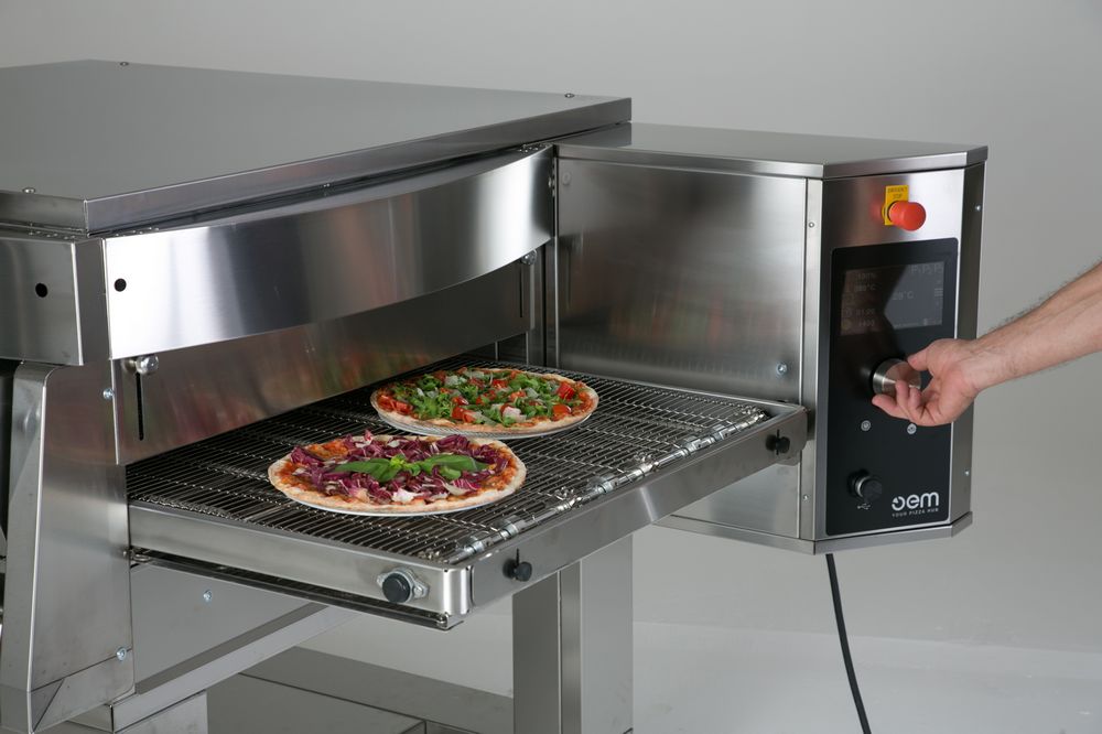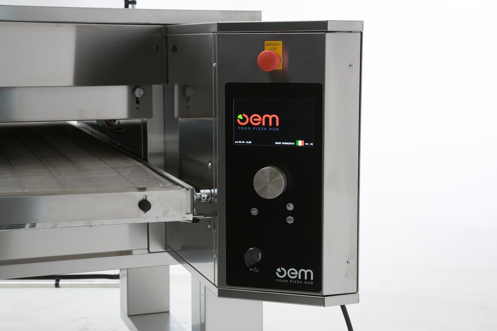Цифровая панель управления: самоочистка, экономичный режим, режим самодиагностики, контроллер с записью 30 программ выпечки пиццы и 30 специальных программ для гастрономической выпечки, кнопка остановки конвейера.