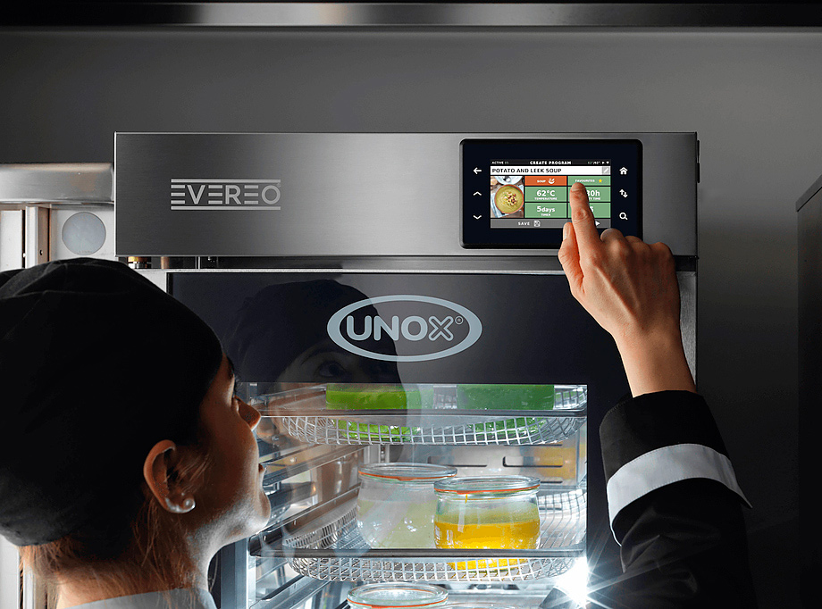 Технология хранения блюд в горячем состоянии по сравнению с хранением в холодильнике позволяет добиться сокращения затрат энергии и времени, а также оптимизировать рабочие процессы ресторана, и даже организовать концепцию «ресторан без кухни», где готовые блюда доставляются централизованно и хранятся в шкафу Evereo.