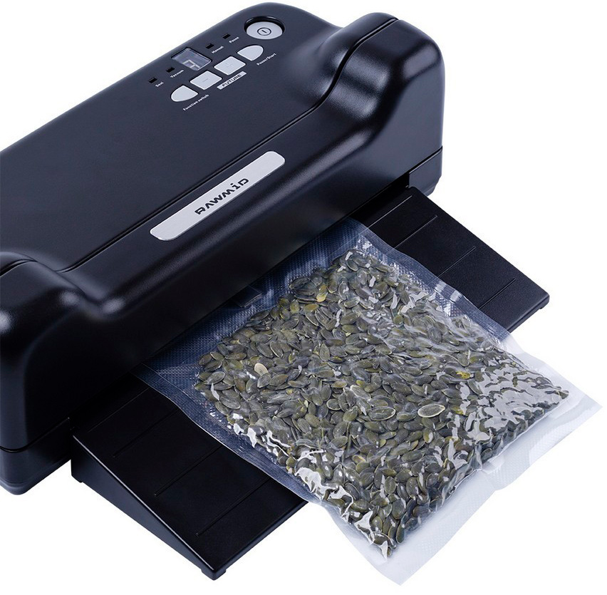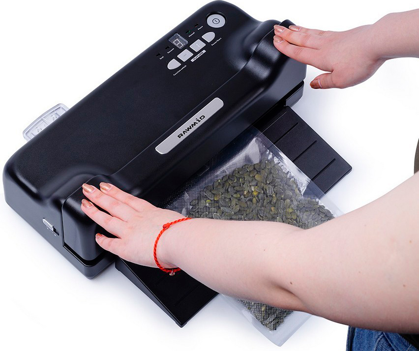 • Вакуумирование любых продуктов. Упаковщик подходит для вакуумирования сухих и влажных, твёрдых и хрупких продуктов, а также напитков. Благодаря наличию специального отсека для жидкости, устройство легко справляется с откачиванием воздуха из влагосодержащих продуктов без риска поломки. В случае частичной откачки влаги, она попадает в съёмный отсек, после чего удаляется. А благодаря гибкой настройке мощности, прибор безупречно завакуумирует даже деликатные продукты, например, чипсы или печенье.